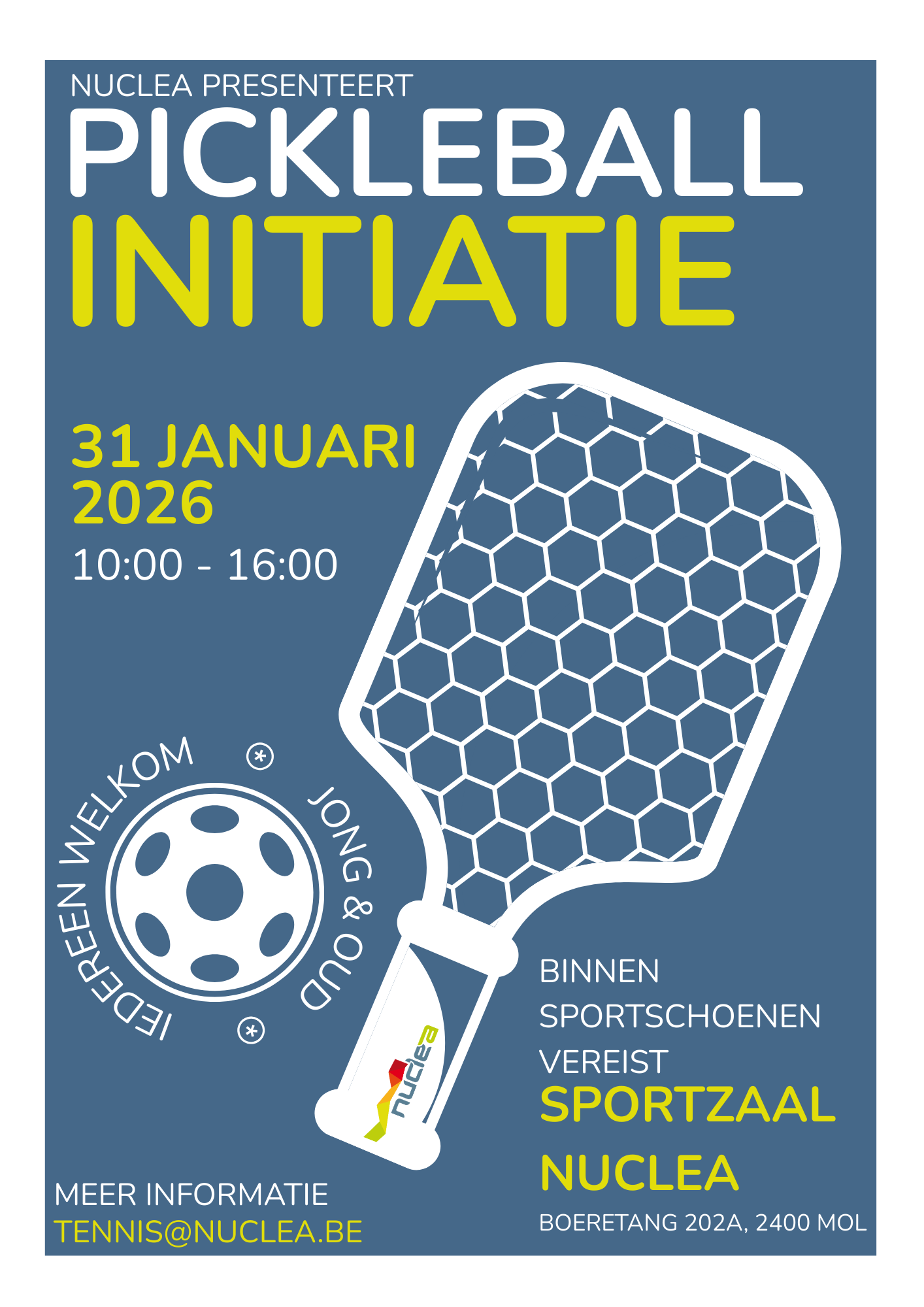 Ontdek één van de snelst groeiende racketsporten! Op 31 januari geven we een toegankelijke en leuke initiatie Pickleball in de sportzaal van Nuclea, doorlopend van 10:00 tot 16:00.