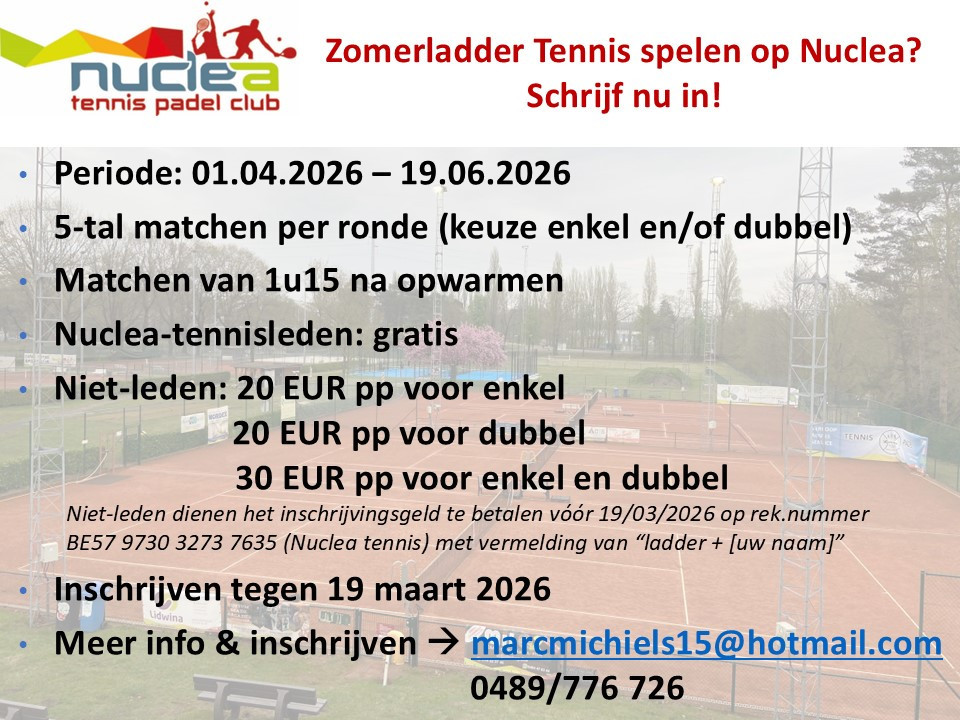 Ook dit jaar wordt de Nuclea ladder opengesteld voor Nuclea leden en voor niet leden. Voor Nuclea-tennisleden is deelname gratis. Niet-leden, aangesloten bij een andere tennisclub, betalen volgende bijdragen :