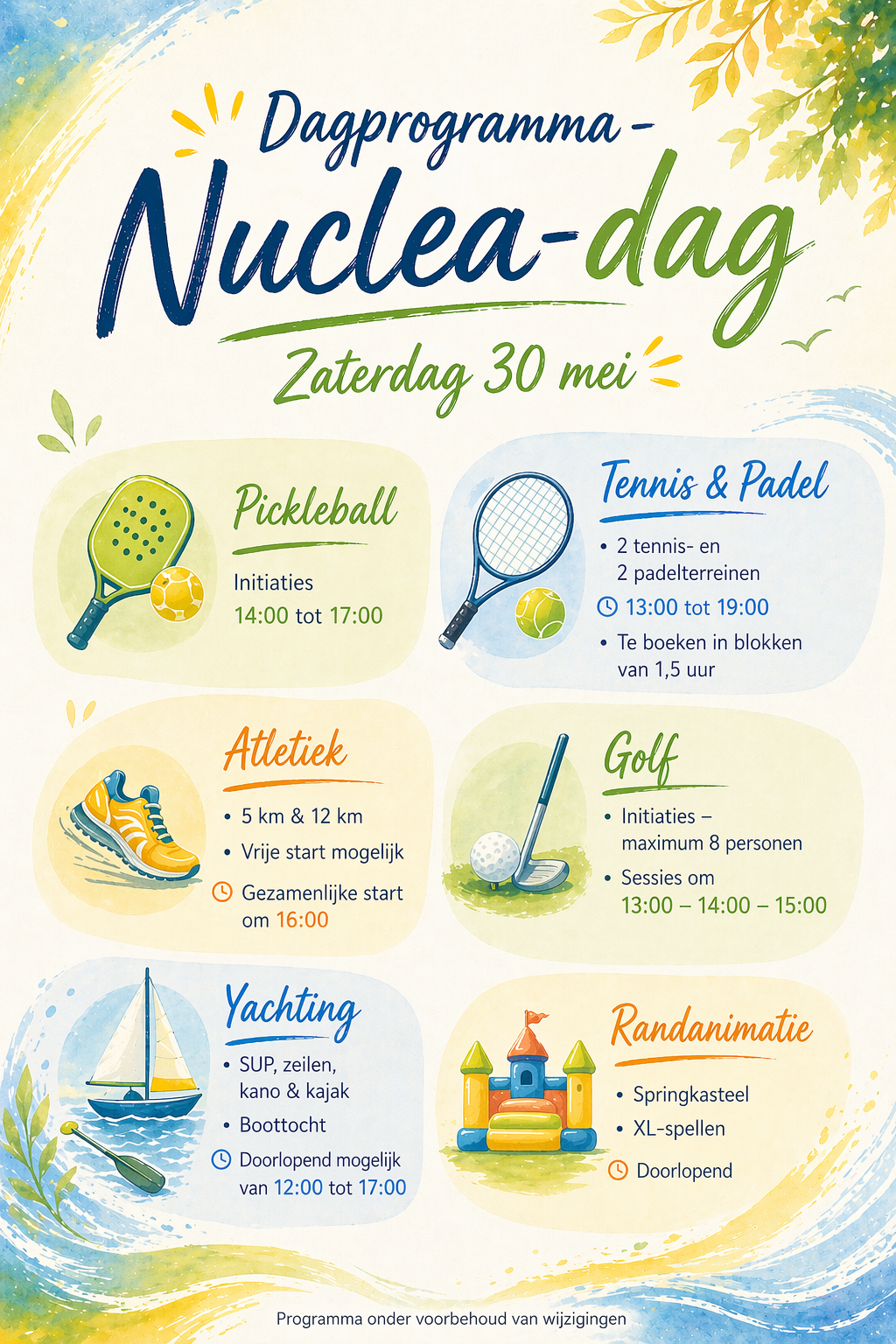 Op zaterdag 30 mei openen we de deuren voor de Nuclea‑dag – Sport & Beleving: een open dag waar sport, ontdekking en gezellig samenzijn centraal staan. Iedereen is welkom — leden, niet‑leden, gezinnen, vrienden en sympathisanten. Kom mee sporten, probeer nieuwe activiteiten uit, laat de kinderen ravotten en geniet van een ontspannen sfeer. Je kiest zelf wat je wil doen, wanneer en met wie.