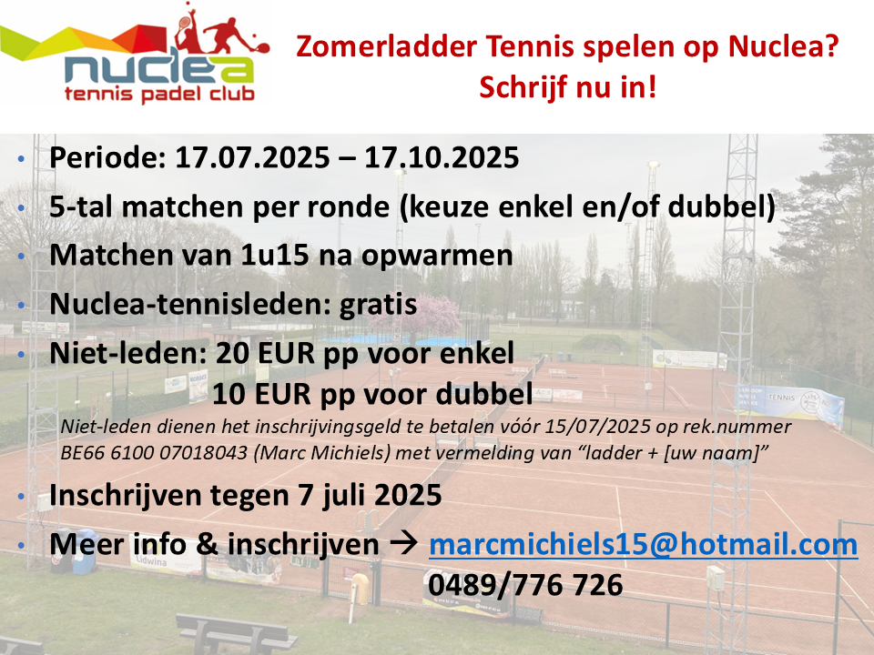 Na het Nuclea tennis tornooi, eindigend op 06 juli 2025 zal er verder gegaan worden met ronde 2 van de laddercompetitie, enkel en dubbel. De matchen dienen gespeeld te worden vanaf 17/07/2026 en voor 17/10/2025.
